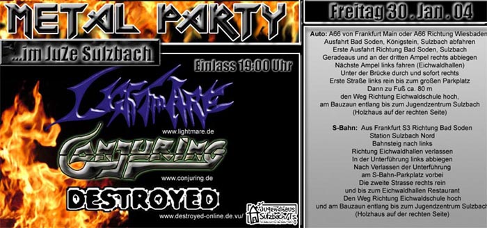 Als Beteiligter "on Stage" ist es immer schwer einen Bericht hier darzulegen. Dankesgrüße an dieser Stelle an Conjuring und Lightmare die uns als Vorgruppe auf die Bühne ließen. Bißchen blöd das wir unseren Soundcheck erst um ca. 20 Uhr machen durften, wo doch der offizielle Anfang schon um 20 Uhr festgesetzt war. Naja egal, um halb neun war Rocken angesagt. Das Juze war gut gefüllt und die Stimmung anscheinend auch recht gut. Wie gesagt, man selbst kann so ein Konzert nie beschreiben, wie der den harten Tönen ausgelieferte Zuhörer.