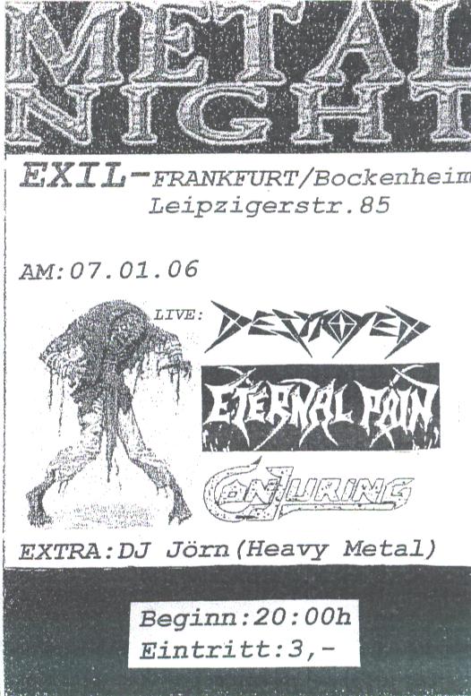 Dies lag wohl an der ausgewählten Lokalität. Da das „Exil“ in Frankfurt-Bockenheim nicht gerade für laute Metal-Events bekannt ist, sondern eher als türkisches Kulturzentrum für folkloristische Hochzeiten und Teegenuss steht, war der 07.01.06 wohl die große Ausnahme im hiesigen Programmverlauf.